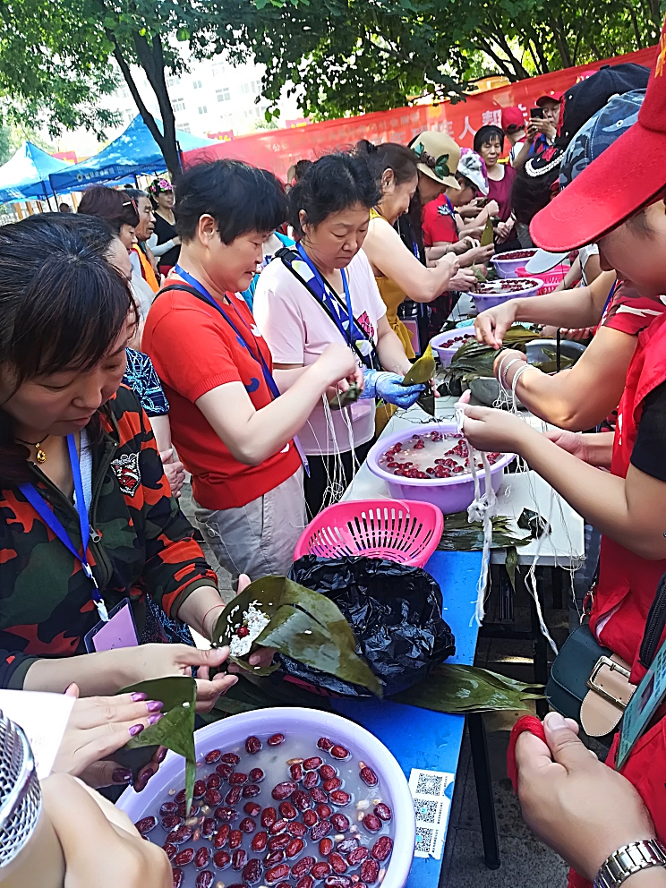 淇滨区黎阳路办事处福源社区的居民在广场举行包粽子活动,展示粽子制作技艺。大家折粽叶、填糯米、扎线……忙得不亦乐乎,一个个粽子,传递着节日的祝福。