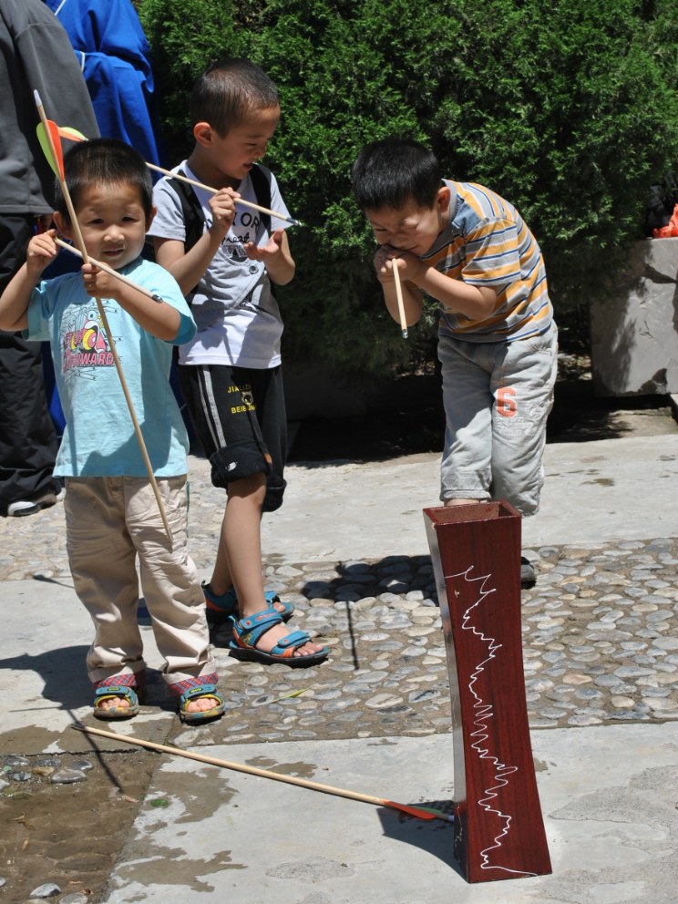淇县通过传统的掷箭入壶游戏,展示端午节的民间习俗,小朋友们聚精会神手捏木箭投向长壶。