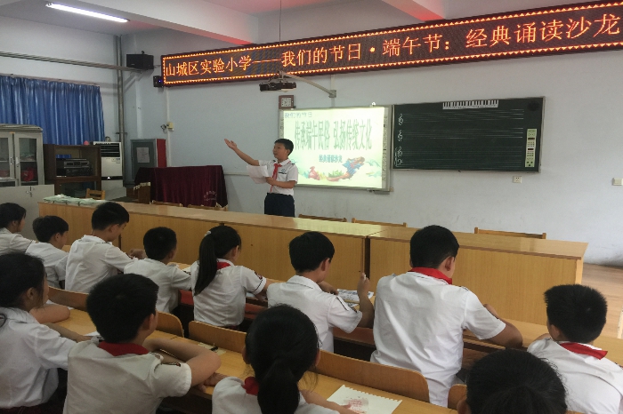 山城区实验小学举行“传承端午民俗 弘扬传统文化”经典诵读沙龙活动,通过吟诵端午民俗诗歌、屈原诗词以及爱国主义诗篇等内容,感受优秀的中国传统文化,增强学生们的爱国主义情感。