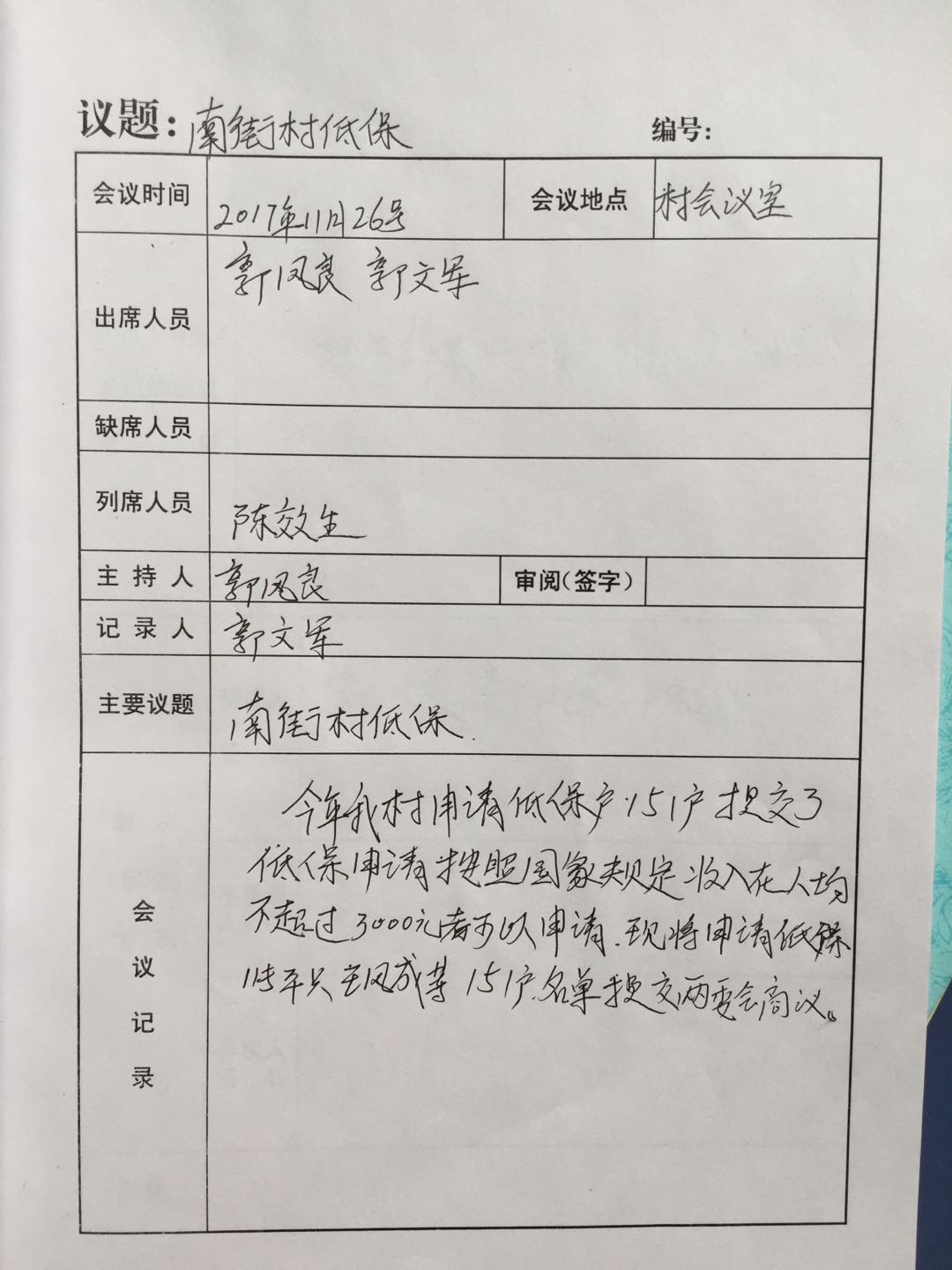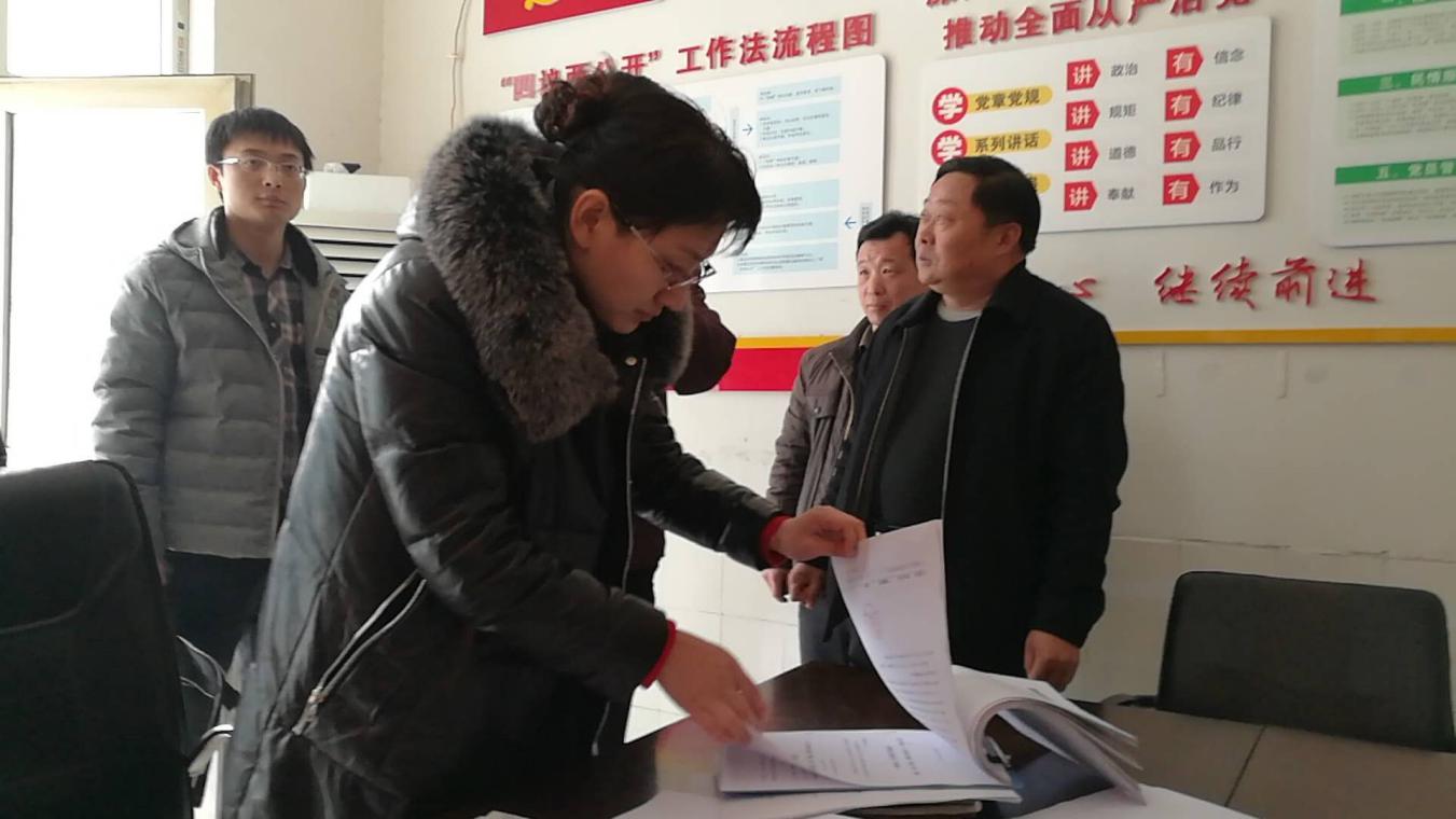 调研组在南街村查看低保方面会议记录