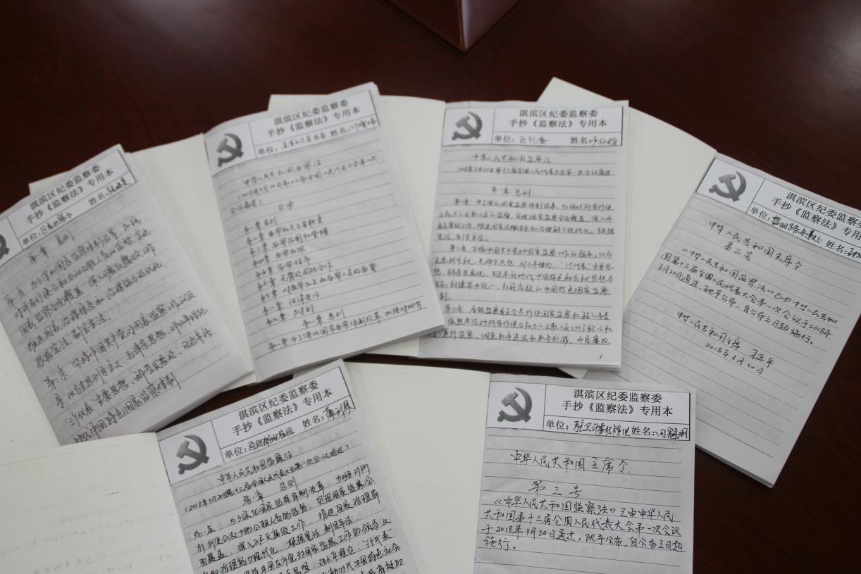 手抄监察法--组织全区纪检监察干部手抄监察法,让大家加深对监察法条文的把握和理解,依法开展国家监察工作。
