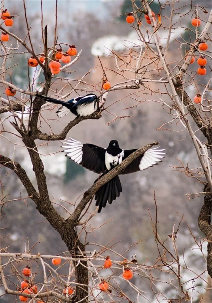 寒露时节,柿树上挂满了喜人的“小红灯笼”,引来喜鹊驻足观赏,构成一幅动人的秋色图。