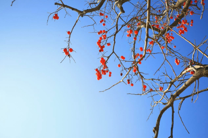 寒露时节,南岭及以北的广大地区均已进入秋季,晴空万里,树叶凋零,枝头上红彤彤的果实为萧索的秋天增加一抹亮色。