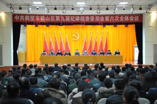 鹤山区 2月15日,鹤山区在区政府二号院大会议室召开九届区纪委六次全会,区委书记李海章同志出席会议并讲话,区委常委、区纪委书记游国庆同志代表区纪委常委会做《把纪律挺在前面 严格监督执纪问责 以反腐倡廉实际成效保障鹤山政治经济社会发展》工作报告。全区县级干部、科级干部和全区纪检监察干部共300余人列席会议。
