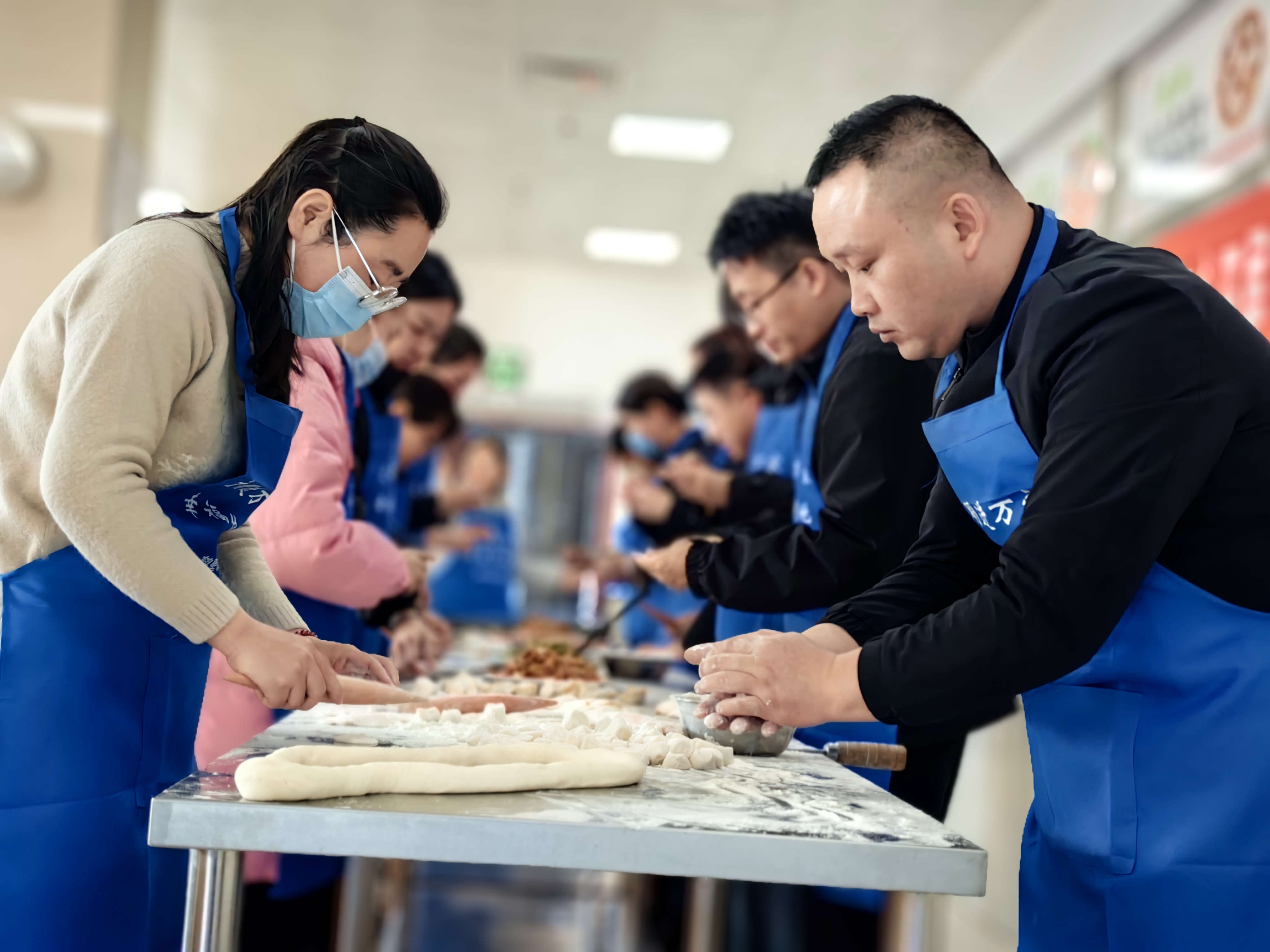 活动现场,干部职工欢聚一堂,分工协作,有的和面、有的拌馅料、有的包饺子,大家一边相互切磋技艺,一边交流着冬至过节习俗,现场气氛和谐,欢声笑语不断。