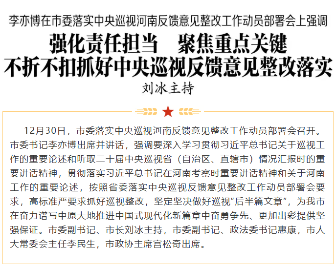 李亦博要求,要加强组织领导,确保巡视整改各项任务落地见效。要始终把严的要求、实的标准贯穿巡视整改全过程,全面对照巡视反馈意见,系统制定整改方案、细化整改措施,压实责任、严明纪律,动真碰硬推动问题改到位改彻底。要深化以巡促改、以巡促建、以巡促治,注重抓源治本、建章立制,强化巡视成果综合运用,切实把巡视整改成效转化为推进焦作高质量发展和高效能治理的实绩实效。