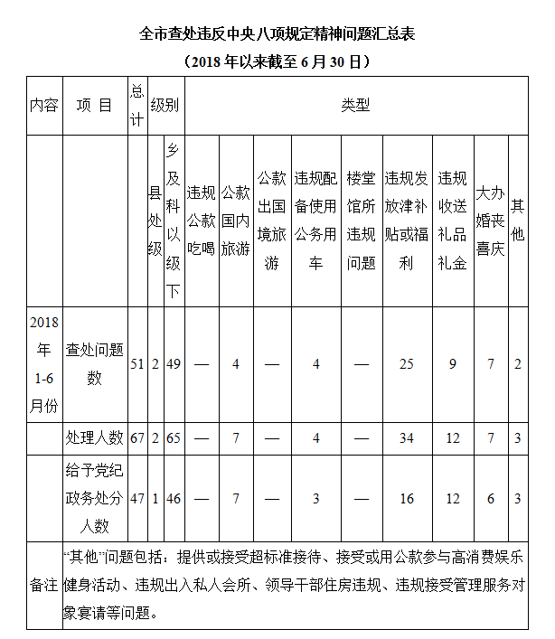 今年1-6月份,全市共查处违反中央八项规定精神问题51起,处理67人,给予党纪政务处分47人。