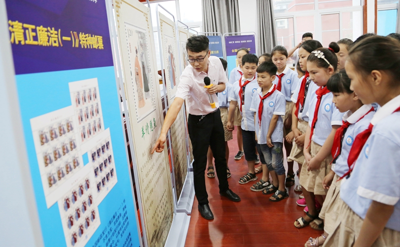 通过播放“《清正廉洁(一)》特种邮票”视频宣传片、展出宣传展板,由老师向同学们进行进一步讲解邮票上“不贪为宝、羊续悬鱼、两袖清风、立檄拒礼”这4个古人居官正直,廉洁自律的故事,为学生们上了一堂生动的廉洁教育课。