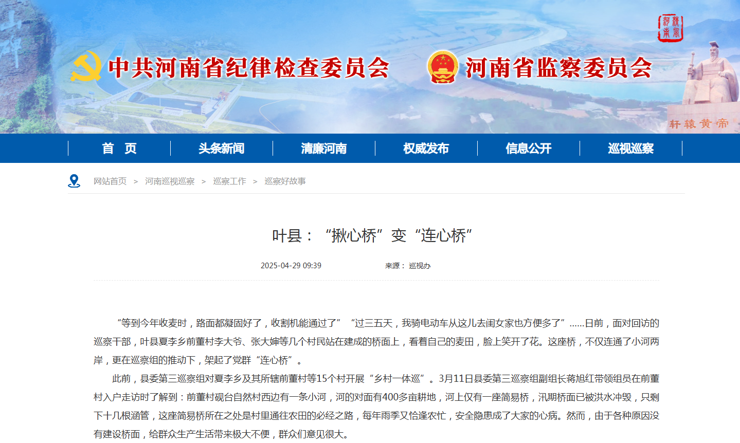 “等到今年收麦时,路面都凝固好了,收割机能通过了”“过三五天,我骑电动车从这儿去闺女家也方便多了”……日前,面对回访的巡察干部,叶县夏李乡前董村李大爷、张大婶等几个村民站在建成的桥面上,看着自己的麦田,脸上笑开了花。这座桥,不仅连通了小河两岸,更在巡察组的推动下,架起了党群“连心桥”。