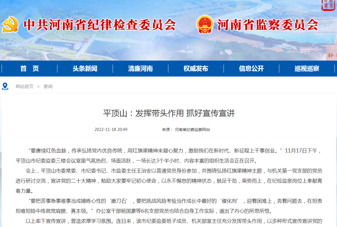 线下宣讲不停歇,线上宣传也要跟上。该市纪委监委在《河南日报》、“清风平顶山”微信公众号上分别开设“监督促发展 正气满鹰城”“聚焦二十大·学悟笔谈”专栏,集中报道全市纪检监察机关学习贯彻党的二十大精神的火热实践,形成强大的宣传舆论声势。截至目前,已刊登市、县两级纪委书记,机关中层干部的署名文章4篇。