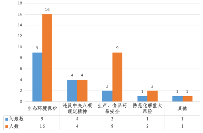 从问责领域看,生态环境保护领域9起16人,违反中央八项规定精神领域4起4人,生产、食品药品安全领域2起9人,防范化解重大风险领域1起2人,其他问责领域1起1人。