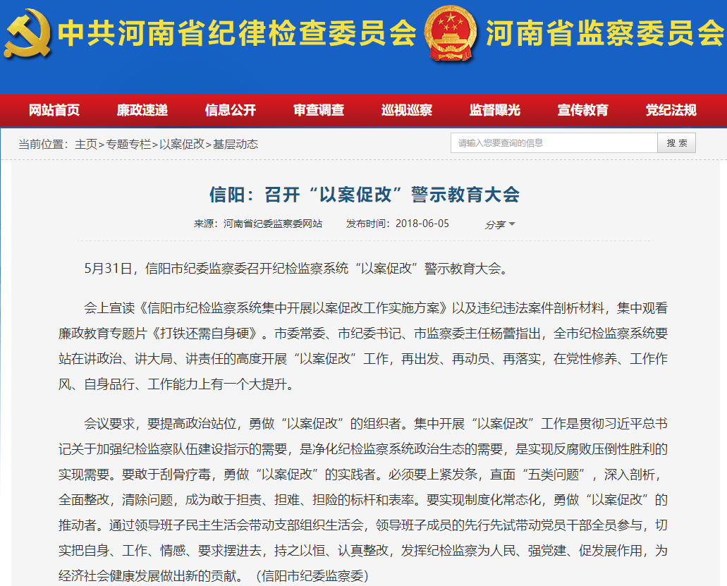 【省纪委网站信息】信阳:召开“以案促改”警示教育大会