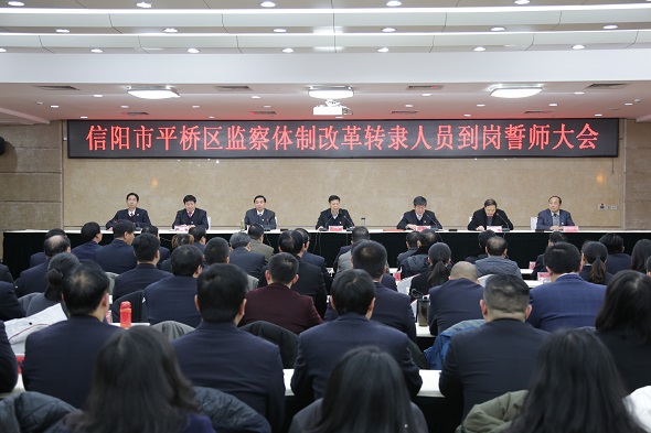 1月5日上午,平桥区召开监察体制改革转隶人员到岗誓师大会。区委书记李灵敏,区领导杨祖兴、黄如福、周伸基、陈勇、梁高峰出席会议。市纪委副书记、市预防腐败局局长戴国松莅会指导。区委常委、组织部长黄如福主持会议。