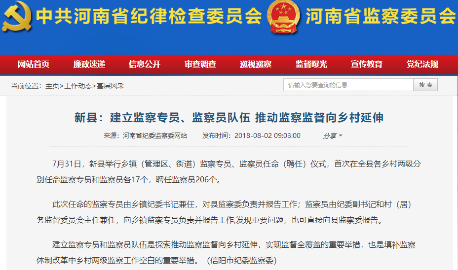 【省纪委网站信息】新县:建立监察专员、监察员队伍 推动监察监督向乡村延伸