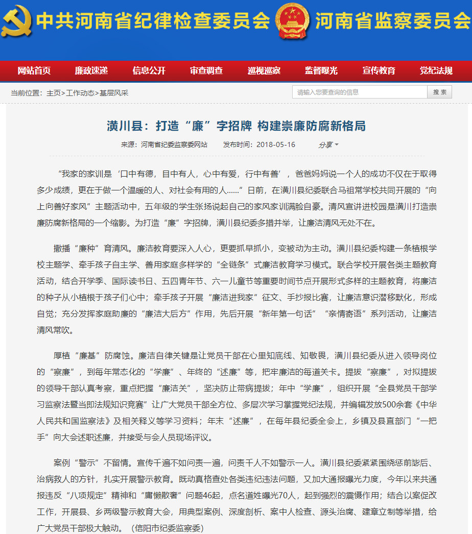 【省纪委网站信息】潢川县:打造“廉”字招牌 构建崇廉防腐新格局