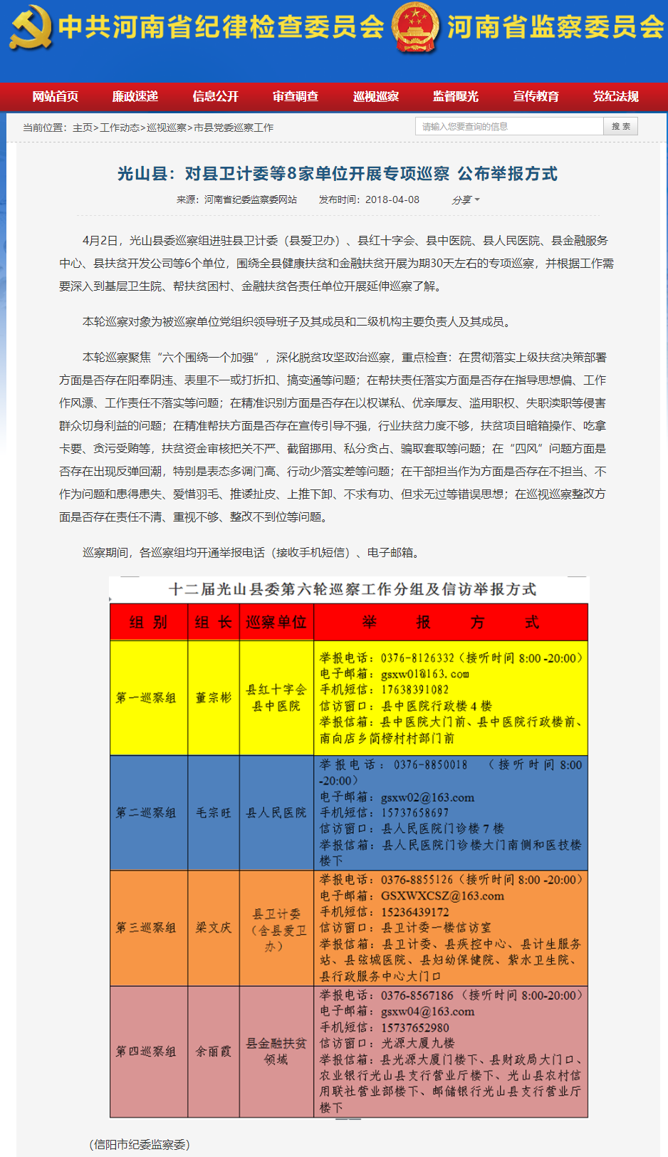 【省纪委网站信息】光山县:对县卫计委等8家单位开展专项巡察 公布举报方式