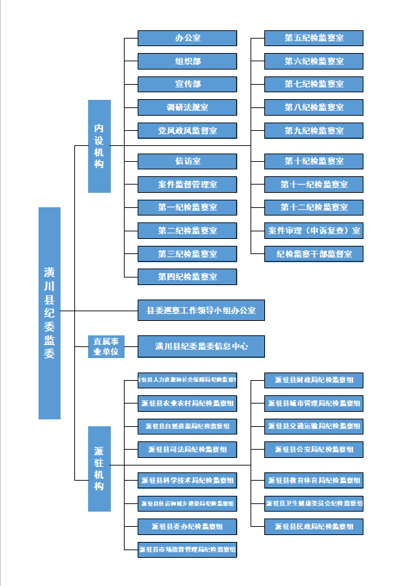 潢川县纪委机关与潢川县监察委合署办公。共有21个内设机构,分别为:办公室、组织部、宣传部、调研法规室、党风政风监督室、信访室、案件监督管理室、第一至第十二纪检监察室、案件审理室(申诉复查室)、纪检监察干部监督室。下属1个事业单位:潢川县纪委监委信息中心。实行统一管理的派驻机构15个。