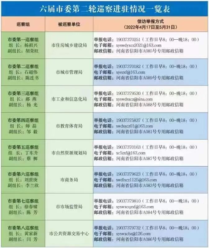 巡察期间,市委巡察组将严格落实中央八项规定精神和相关规定,主动接受被巡察对象和社会各界的监督,市纪委监督举报电话:0376-12388,市委组织部监督举报电话:0376-12380。